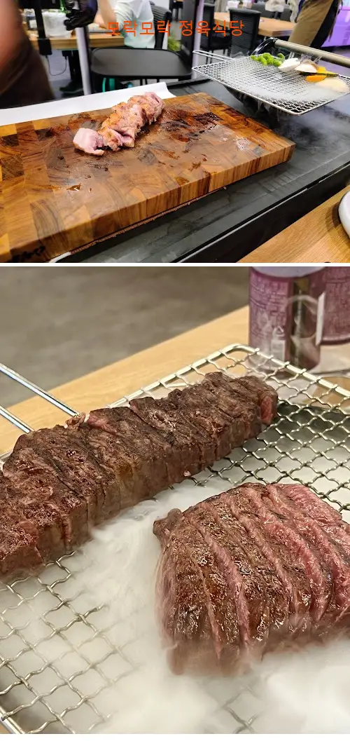 -국물이 꽤나 깔끔한편이다. 돼지의 잡내 또한 나지 않고 건더기의 양도 꽤 많다.요즘 순대국 매니아들 사이에서 화제인 순대국에 들어간 순대가 당면인지 아닌지에 대해서는 영상을 보면 아실 수 있을 듯하다. 같이 내어주시는 밥은 압력솥밥에서 나가기 직전에 밥을 퍼서 주시는 방식이라 일반 공기밥보단 찰지고 김이 모락모락하다. 모듬순대는 김치순대, 백순대, 야채순대 이렇게 나오는데 김치와 백순대가 약간 매콤한 맛이 있어서 매운거 잘 못드시는 분들이라면 맵다고 느낄 수 있을 것 같다.(맵기 김치>백>야채) 순대는 안이 꽉차있고 맛있었다. 그리고 모듬순대 접시 아래에 고체연료로 불을 지펴서 끝까지 순대를 따뜻하게 먹을 수 있었다.