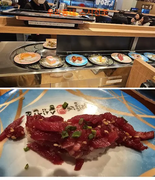 김태연 2인이라 웨이팅시간은 짧았지만 좌석이 ㅎㄷㄷ 뱃살있던 나에겐 몹시 협소했습니다 정말 날씬하신분들은 무리가 되진 않겠지만 ... 음식은 회전 테이블에 도는 음식 대신 주문후 먹었습니다. 회전판에 도는 초밥들이 말라보이는것들이 다소 눈에 띄어서.. 흰살생선초밥 매니아라 광어초밥 위주로 먹었네요. 우니는 훗카이도에서 먹었던게 너무 기억에 남다 보니 비교하기가 상당히 어렵습니다. 가격대비 광어초밥은 가성비가 좋다 느낍니다. 육회.장어.우니. 외 몇가지 맛보지 않았습니다. 웨이팅이 긴 곳이라했는데 2인은 그래도 빠르게 식사가 가능했기엔 감사히 맛있게 먹고 왔습니다. 기억에 남는 한가지는 주문한 접시 퇴식구가 테이블에 있어서 직접 먹으며 카운터가 되고 계산까지 자리에서 하구 나오니 술.음료 주문 외엔 따로 직원 응대가 없습니다