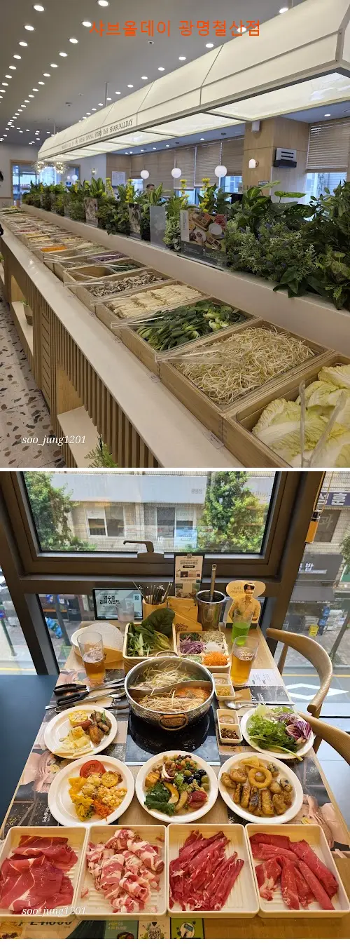Sang eun Lee 광고 많이하는 샤브올데이가 철산 새로운 건물에 생겼습니다. 건물이 새건물이라 완전 깨끗했고 규모가 어마무시 했습니다. 철산에 있는 식당 중 가장 큰 것 같습니다. 회사 회식 몇 팀이 와도 될 듯~ 테이블도 명수 다양하게 아주 많고 음식 놓여있는 배식대도 정말 컸습니다. 샤브사브에 들어가는 야채랑 어묵 면류 외에도 정말 가짓수가 많았고 소스 종류도 많았습니다. 다진 고추와 마늘도 있었습니다. 무엇보다 고기도 무제한~ 아주 좋았습니다!!! 음식도 바로바로 채워주시더라고요~ 그런데 뷔페 가도 생각보다 많이 먹지 못하잖아요. 너무 아쉬웠습니다. 들어갈때는 줄 안섰는데 계산할때는 한참 줄서서 계산했네요. 새로 생겨서 아직 정신없는 부분은 있습니다^^