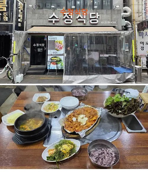 맛집여행이정표 종로3가역 가까이에 있는 수정식당에서 제육쌈밥 맛있게 먹고왔어요. 종로 수정식당 관수동에 있어요. 직원분들 다들 친절하세요. 매장 깨끗했어요. 제육쌈밥 가성비 넘넘 만족스러웠어요. 저녁 시간 제육쌈밥이 10,000원이예요 저녁시간 여차하면 줄서서 대기해야 합니다. 아마 가성비가 좋은 고기집이라 줄서서 대기하게 되는 모양입니다. 다행히 조금 일찍 간 덕분에 바로 입장해서 식사 할 수 있어 다행였습니다. 대부분 제육쌈밥 아니면 삼겹살 구워먹는 모습이 보였어요. 제육쌈밥 밥과 된장찌개, 쌈채소, 제육볶음이 나오는 세트로 완전 만족스러웠습니다. 제육볶음 잡내없이 깔끔헸어요. 맵기도 적당했어요. 뒷맛까지 깔끔했던 제육쌈밥 매우 만족스러운 한끼였습니다. 재방문의사 100% 밥집입니다.